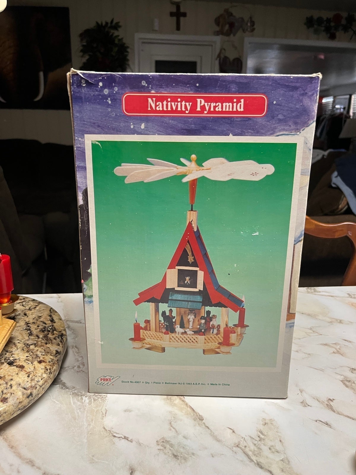 1993~Price (A.E.P.) Hand-Crafted Wood Nativity Pyramid Windmill W/Candle Holders. This is a beautiful nativity pyramid. You just barley touch the top of blades & it goes around. It does not include batteries. This has only been used 1X. It’s in good condition with no chips or cracks on the wood. It does have some red candle wax on small part of wood.