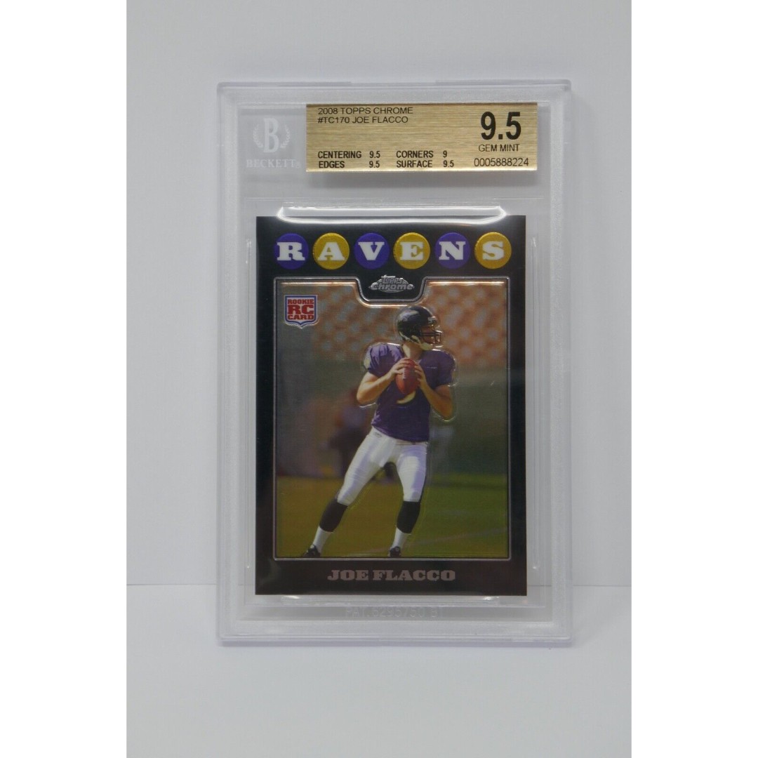 This 2008 Topps Chrome #TC170 Joe Flacco Rookie trading card is a must-have for fans of the Cleveland Browns. This sports trading card is in excellent condition and has been graded 9.5 GEM MINT by Beckett Grading Services. It is a standard size card and features Flacco's rookie year stats. This card is perfect for collectors looking to add a rare and valuable piece to their collection. Don't miss out on the opportunity to own this amazing piece of football history!