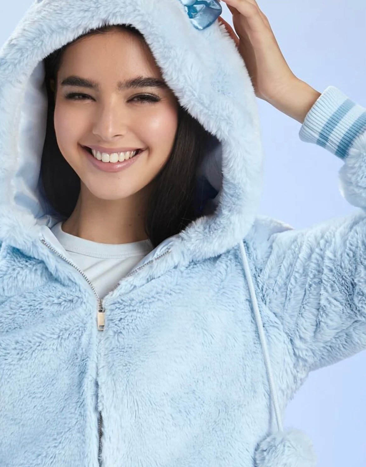 This is a zip-up hoodie with a hood that has protruding ears and a bow.