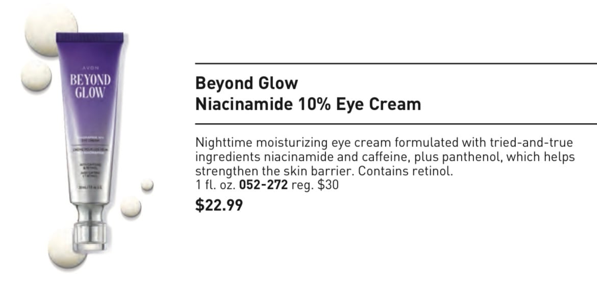 Beyond Glow Niacinamide 10% Eye Cream: Nighttime moisturizing eye cream formulated with tried-and-true ingredients Niacinamide and Caffeine, plus Panthenol, which helps strengthen the skin barrier. CONTAINS RETINOL. 1 fl. Oz