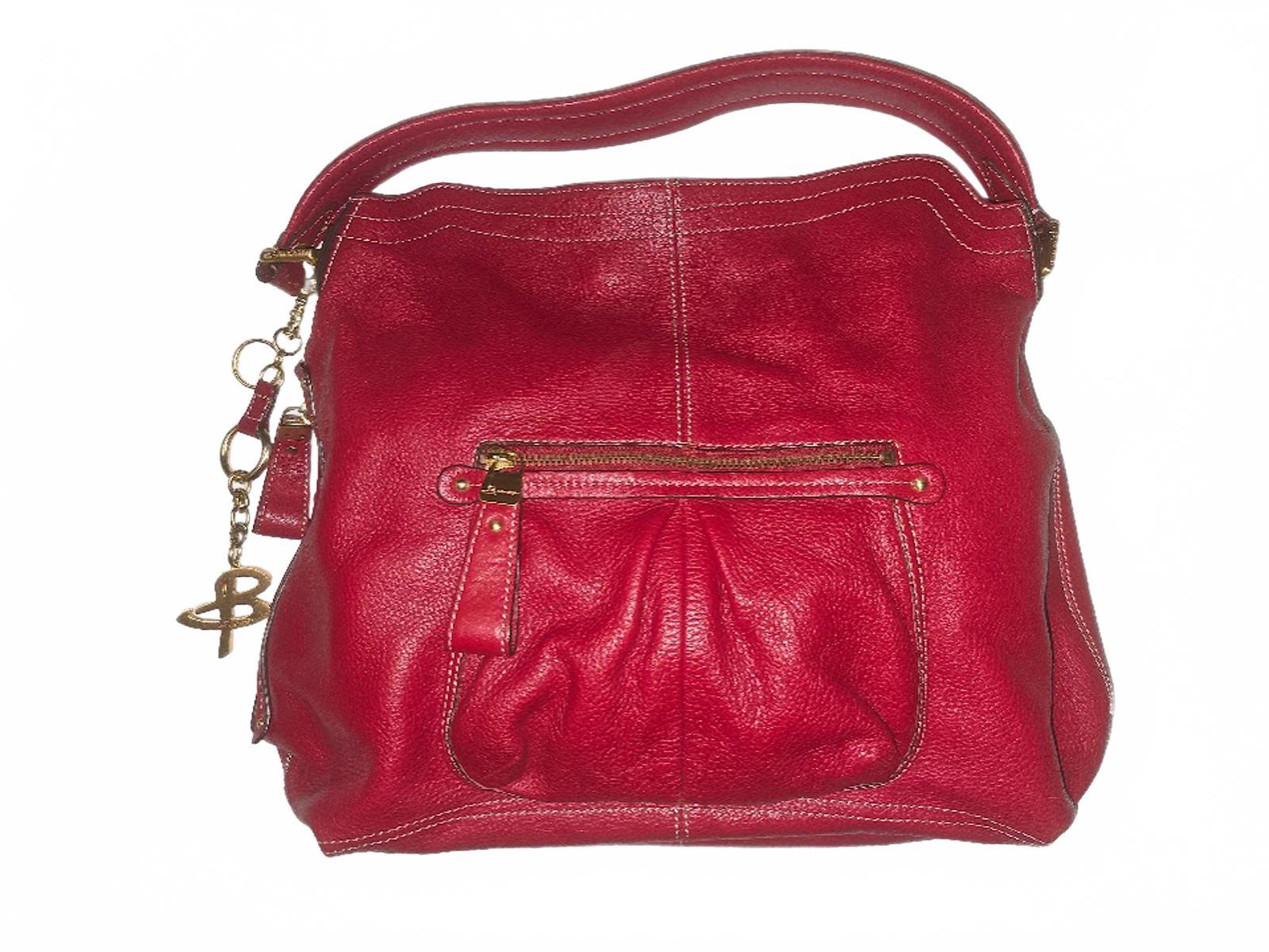 Elevate your style with this B. Makowsky shoulder bag, crafted in soft cranberry red pebbled leather with bold heavy gold-tone hardware. This large tote combines designer flair with everyday functionality, featuring multiple inner and outer pockets to keep your essentials perfectly organized.