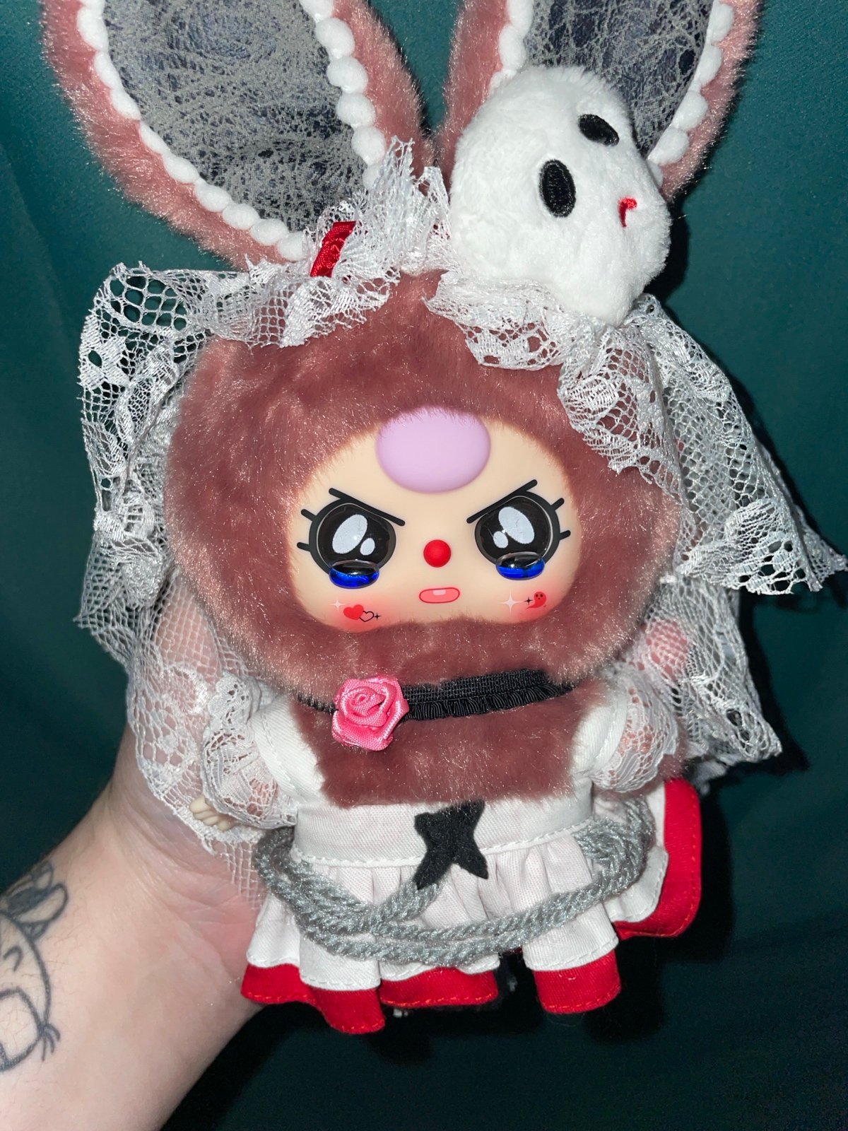 This gorgeous little widow is just begging to come home with you! She has the cutest outfit, she’s so soft, and her veil is actually huge! Her crying eyes and halloween facial markings make the perfect combination. She’d love to hang out on your bag or keys, and it’s the perfect time of year to get the halloween stuff out! She will come with her card :)