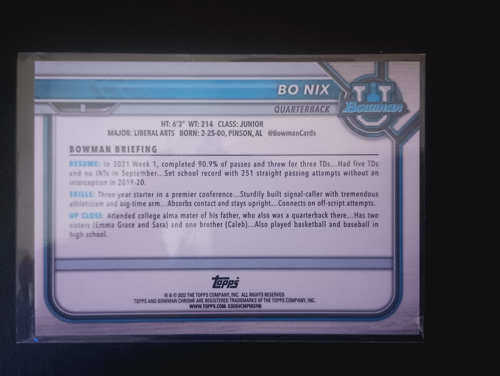 Get your hands on this rare BO NIX 2022 Bowman U Chrome 1st Bowman Silver Refractor #8 (RC) trading card! This card features Bo Nix, the quarterback for the Denver Broncos, it is a part of the 2022 Bowman University Chrome set and is a great addition to any sports card collection.