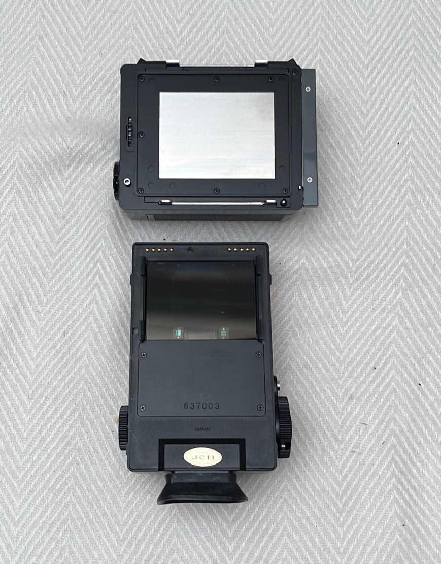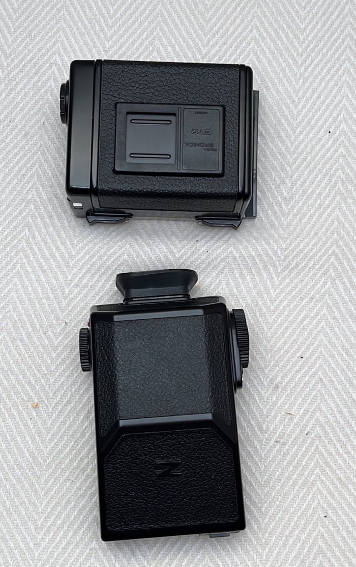 Zebra Bronica ETR Si 6x4.5 Main Camera Body with Bronica ETR Si Motir Winder Ei II, Bronica AE II prism view-finder, and Bronica 120mm film back with original instruction book to the camera body and original instruction book for motor winder and original instruction book AE-II Finder E