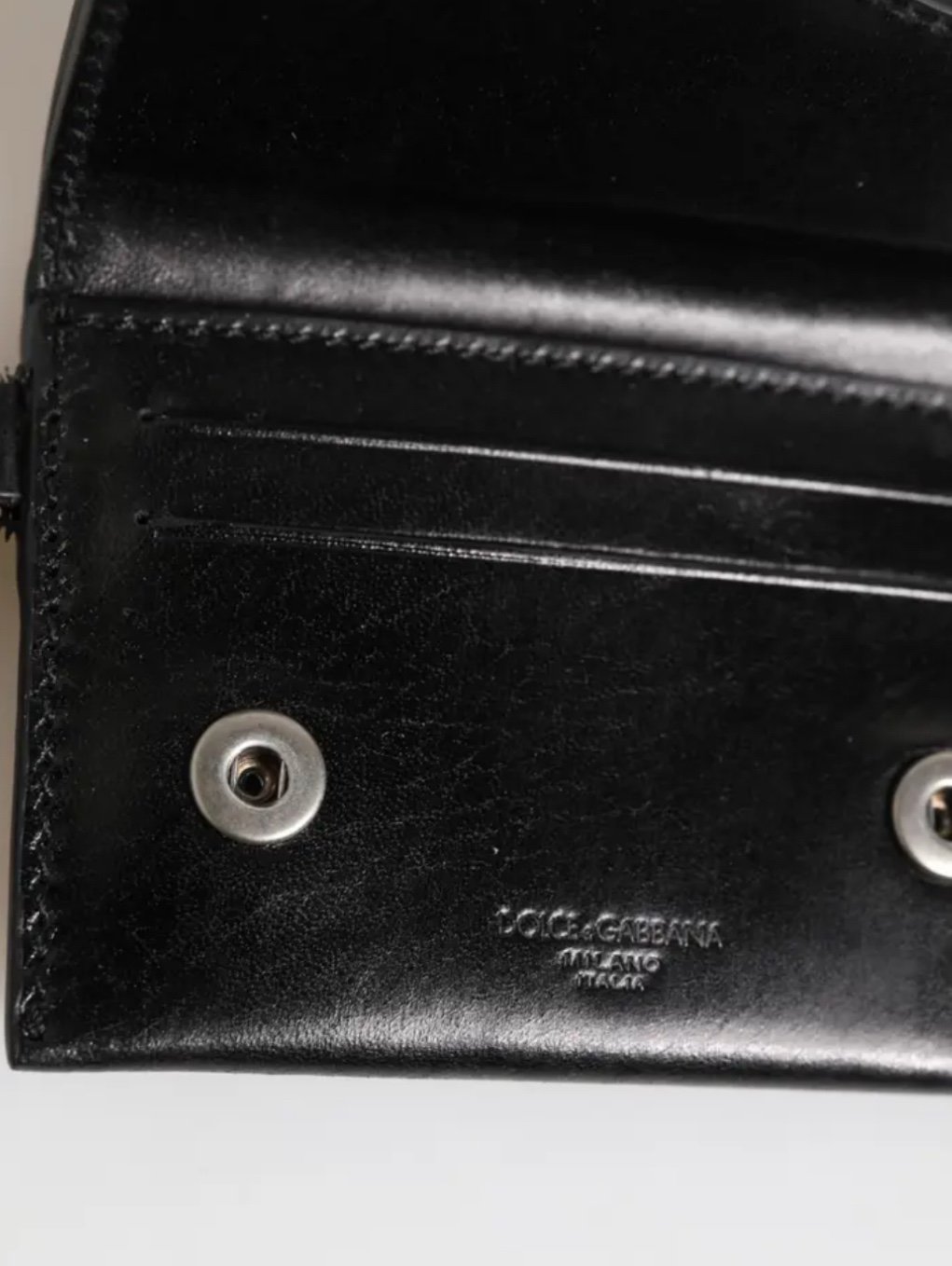 Gorgeous brand new, 100% Authentic Dolce & Gabbana bifold cardholder wallet, crafted in Italy from luxurious cavallo leather (pony-style haircalf). This sleek and compact wallet features a bold snap-button flap closure with iconic DG monogram hardware and a detachable silver-tone chain for added edge and functionality.