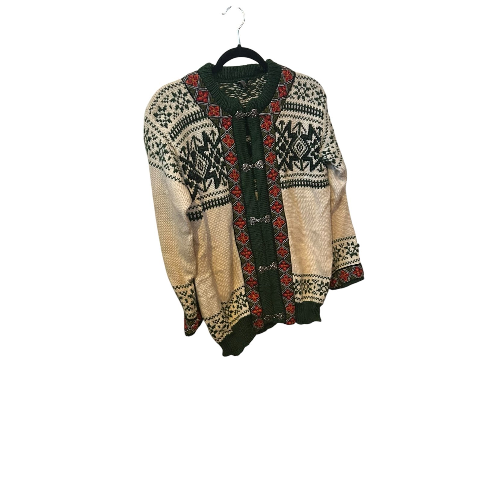 Dale Of Norway Unisex/Men’s Size Extra Small Metal Closures 100% Pure New Wool. Cream with red and green fair isle design cardigan sweater. Great for the winter and the holidays. One small pull of green thread on left cuff as pictured. Light pilling. Two small spots on the back as pictured. Size is unisex/men’s extra small. Approximate measurements: chest 34 inches.