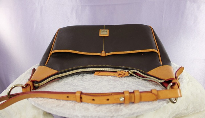 This elegant Dooney & Bourke Pebble Grain shoulder bag showcases a timeless combination of dark brown textured leather and tan trim with gold-tone hardware. Designed for everyday use, it features a front slip pocket, flat base with protective feet, and an adjustable leather strap with buckle accents. The interior is fully lined in the brand’s signature red fabric, offering multiple pockets and a convenient key leash for easy organization. A beautiful blend of durability and style in a classic silhouette.