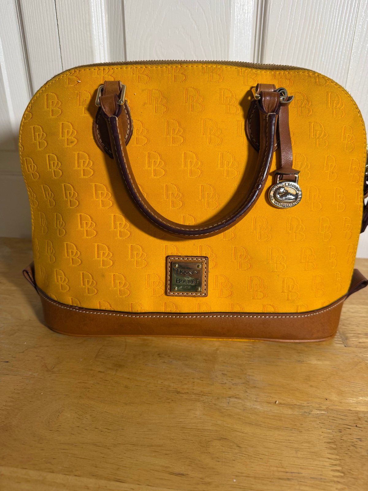 Brighten up your wardrobe with this gorgeous and classic Dooney & Bourke Signature Domed Satchel! This bag features the iconic "DB" logo print in a sunny marigold yellow, beautifully accented with rich brown Vacchetta leather trim. It's the perfect size for everyday use and adds a cheerful, preppy touch to any outfit. The structured silhouette is timeless!