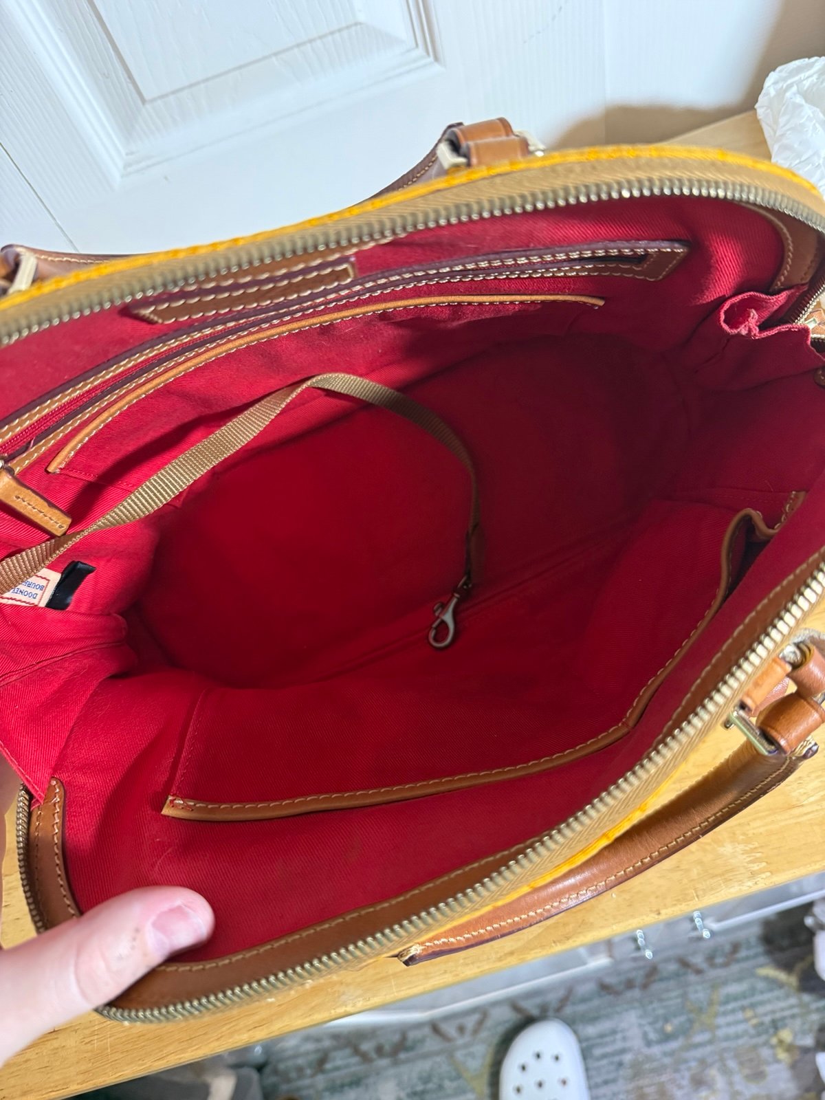 ☀️ Gleaming gold-tone hardware and the signature Dooney duck charm.