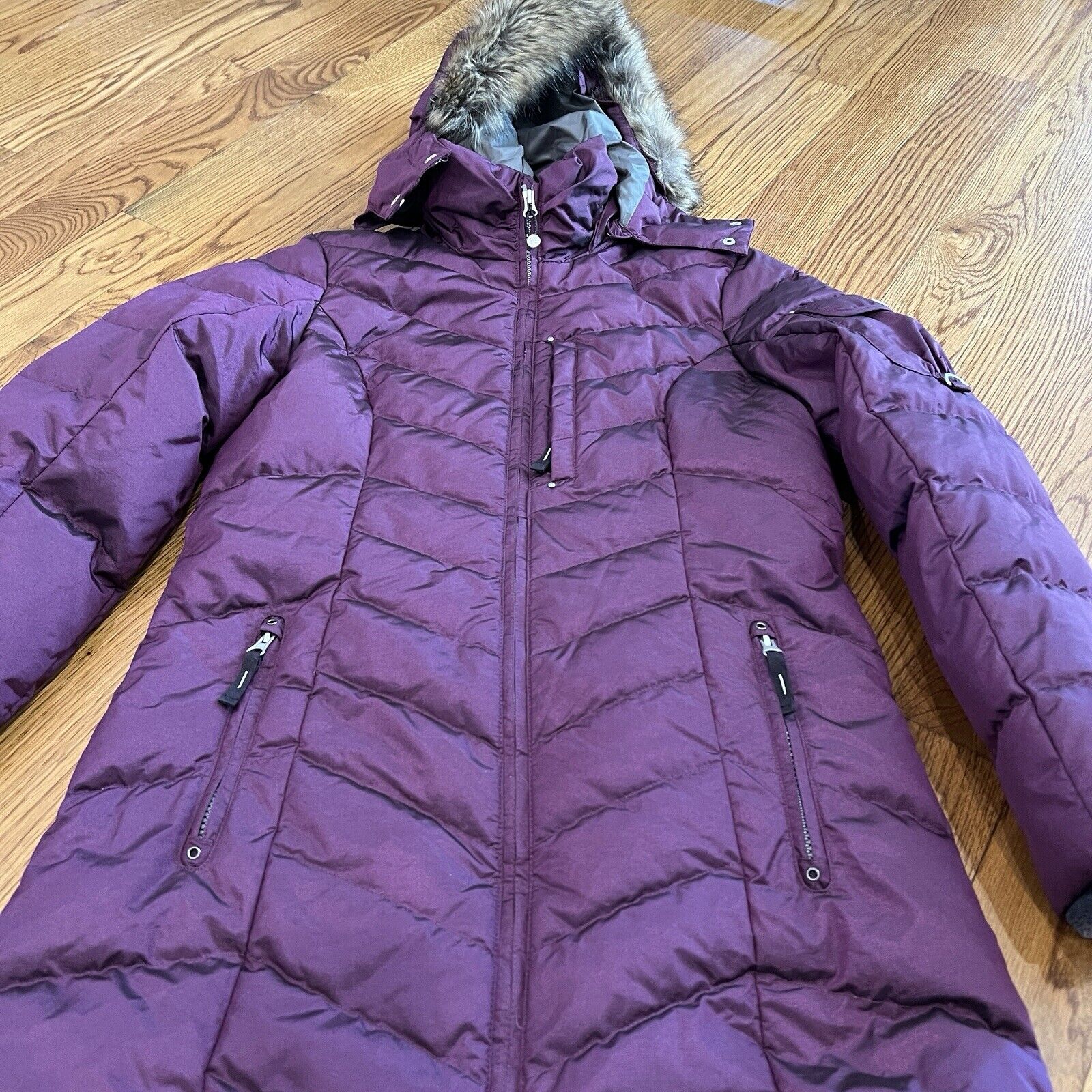 This is an Eddie Bauer Women's Size Small Purple Long Puffer Down Parka Coat with Faux Fur Trim. It features a zip and snap closure, lined with polyester, and insulated with down. The coat has a removable hood, zipped pockets, and is lightweight. Perfect for winter, the coat is designed in a solid purple color with a knit fabric type, making it suitable for various occasions from casual to formal wear.