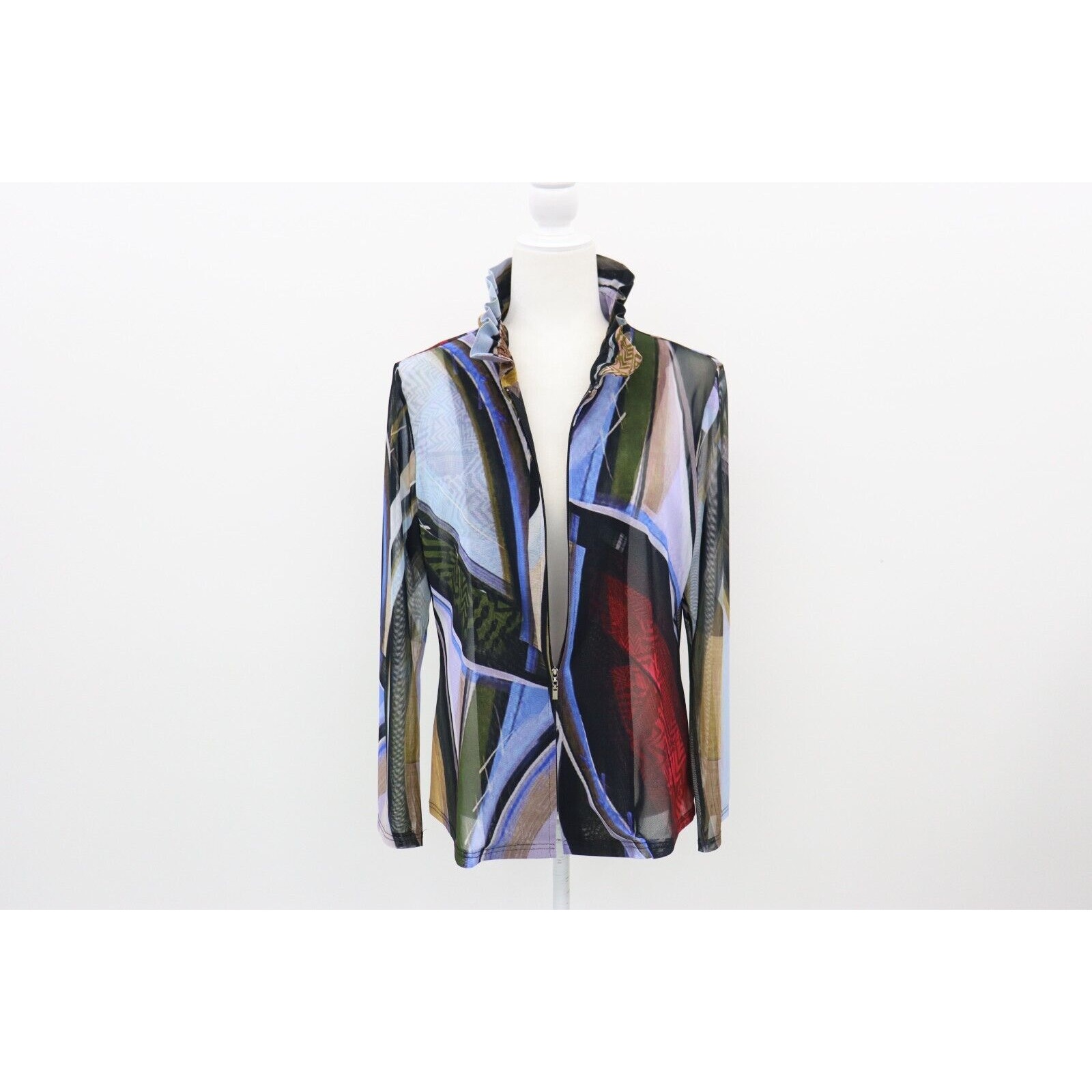 Elevate your wardrobe with this stunning Frederique jacket in a beautiful geometric print. The sheer fabric adds a touch of elegance to this classic jacket style, while the ruffle collar and long sleeves provide a feminine touch. The zipper closure ensures a perfect fit, while the pockets add practicality to this statement piece. Perfect for any occasion, whether you're headed to a party or just dressing up a casual outfit, this jacket is sure to turn heads.