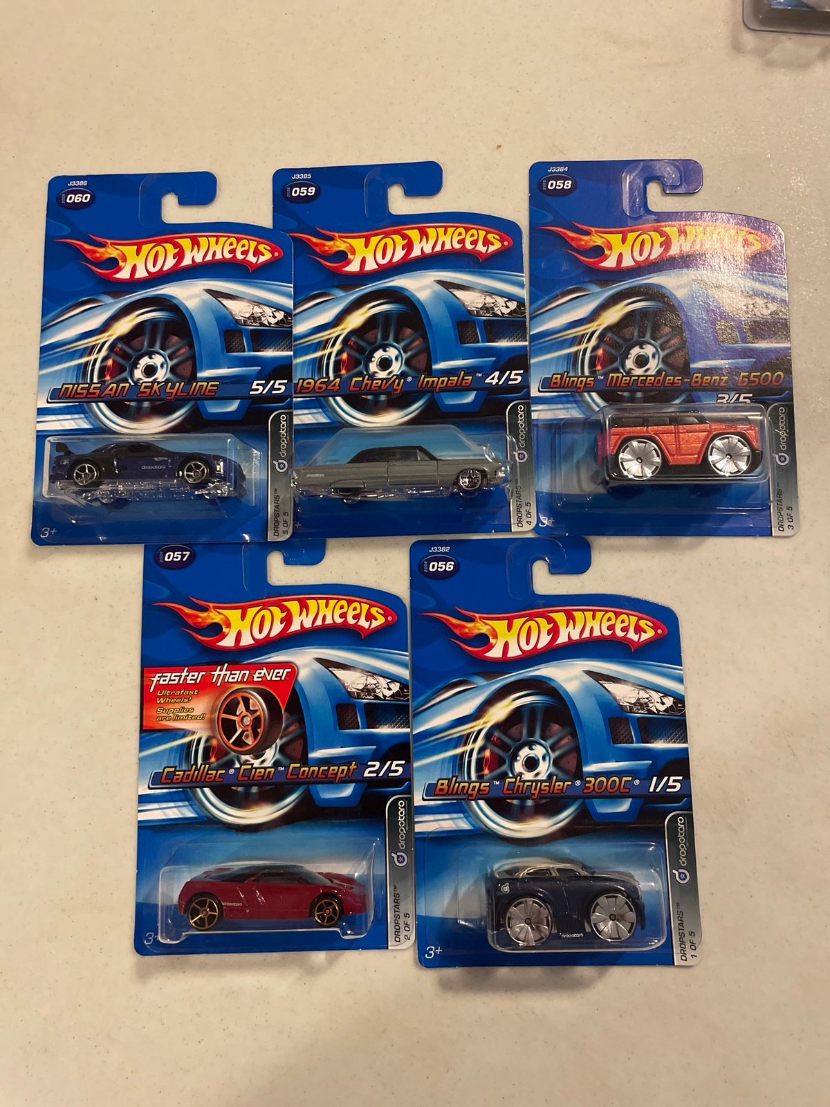 2005 cars 56-60 Dropstars set includes The Nissan Skyline, 1964 Chevy Impala, Blings Mercedes-Benz G500, Cadillac Sien Concept and a Blings Chrysler 300C.