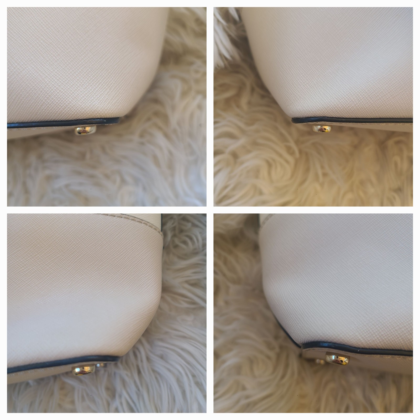 The exterior has a few faint marks. The back bottom of the bag has lost a little shape. The interior of the bag is very faded and has marks. Please look at all of the pictures.
