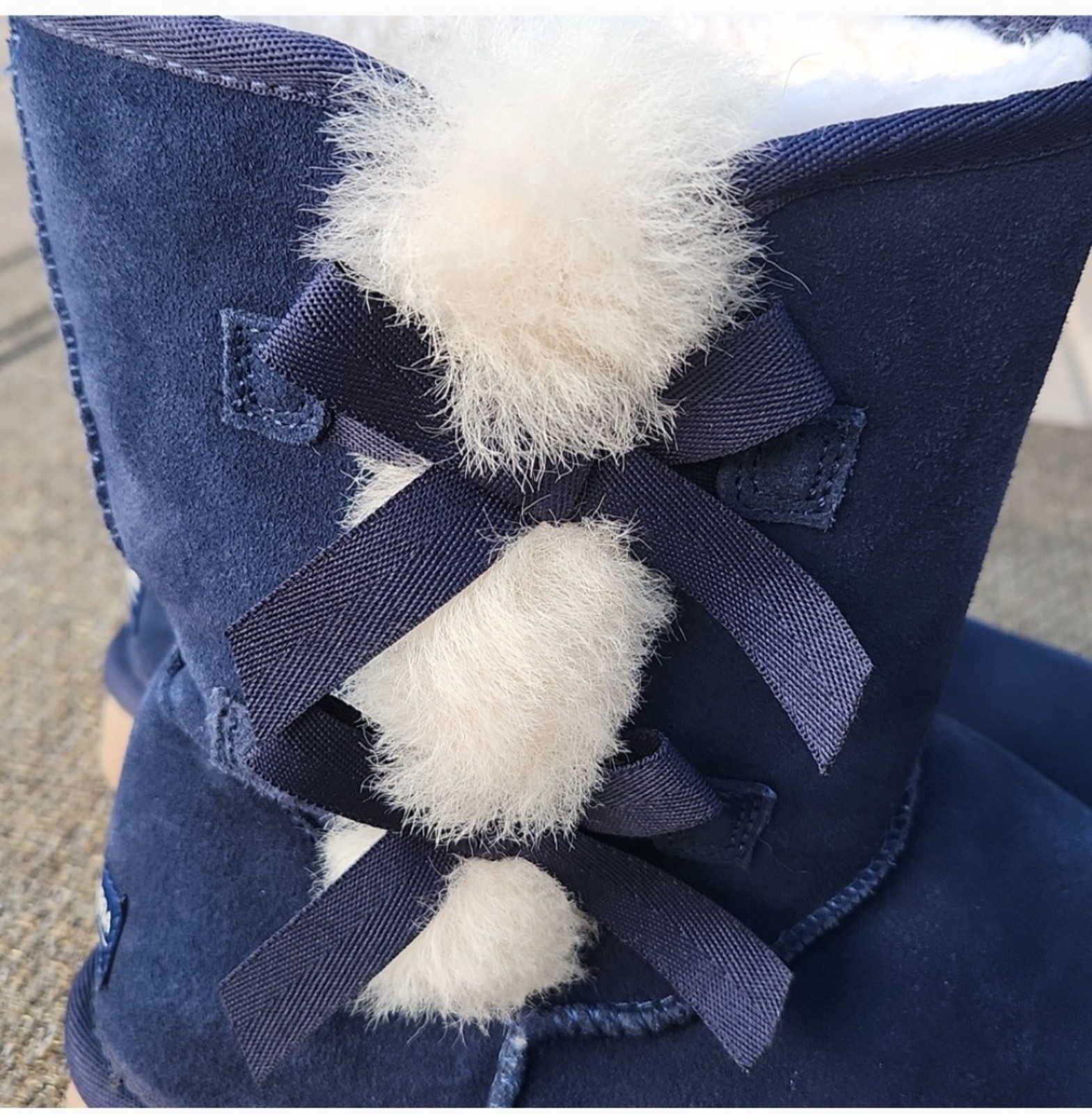 Soft suede upper adorned with dainty bows and plush, exposed sheepskin. Faux-fur and shearling interior. This product contains real fur: Sheepskin, dyed and treated from Australia. See all pics, includes one stock photo.