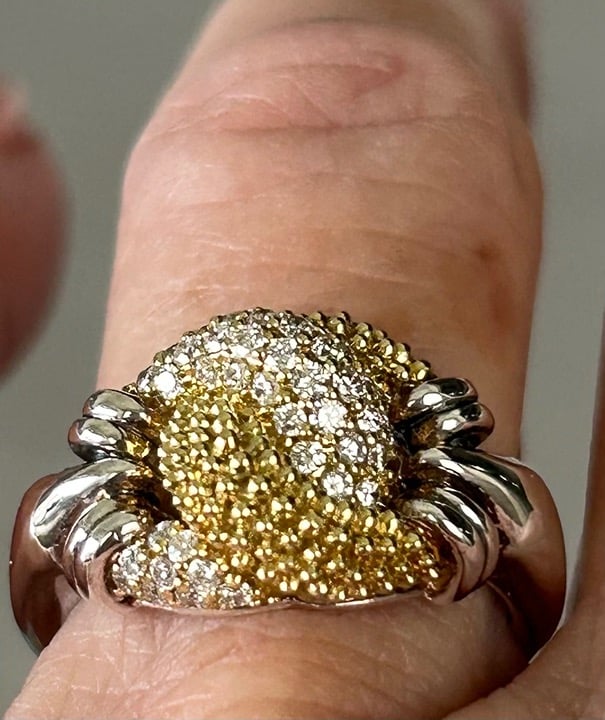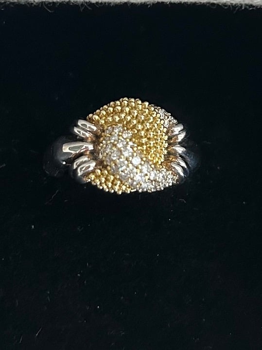 Gorgeous Lagos Lux Caviar Knot Ring size 7 (can be sized up or down). Sterling Silver & 18K Gold, 0.45 Diamonds G-H color SI clarity, measures 12 x 14.3, band width 4mm tapers to 2mm. Style #02-80728DD7. Current Lagos retail $2500.00.