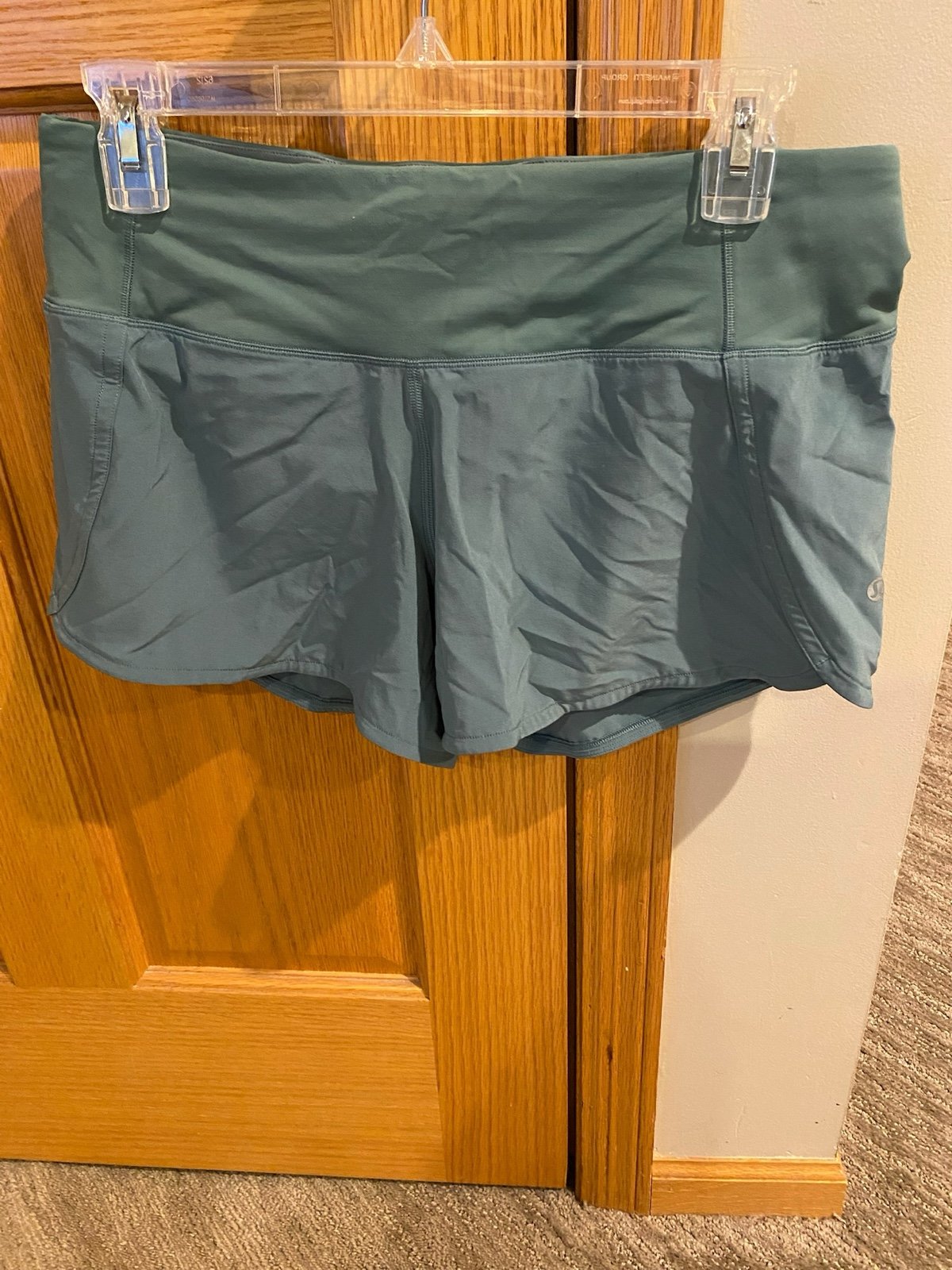 A gently used excellent (no flaws) Lululemon Aquatic Green Run Times II 4 inch short in a size 8.