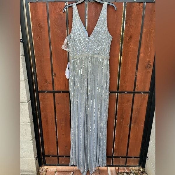 Mac Duggal 5219 plunging surplice gown with cascading rows of hand-sewn sequins and beads. Waist is accented by an intricately beaded belt and the gown features a v-back and sweeping train. Cups are included in the bodice.