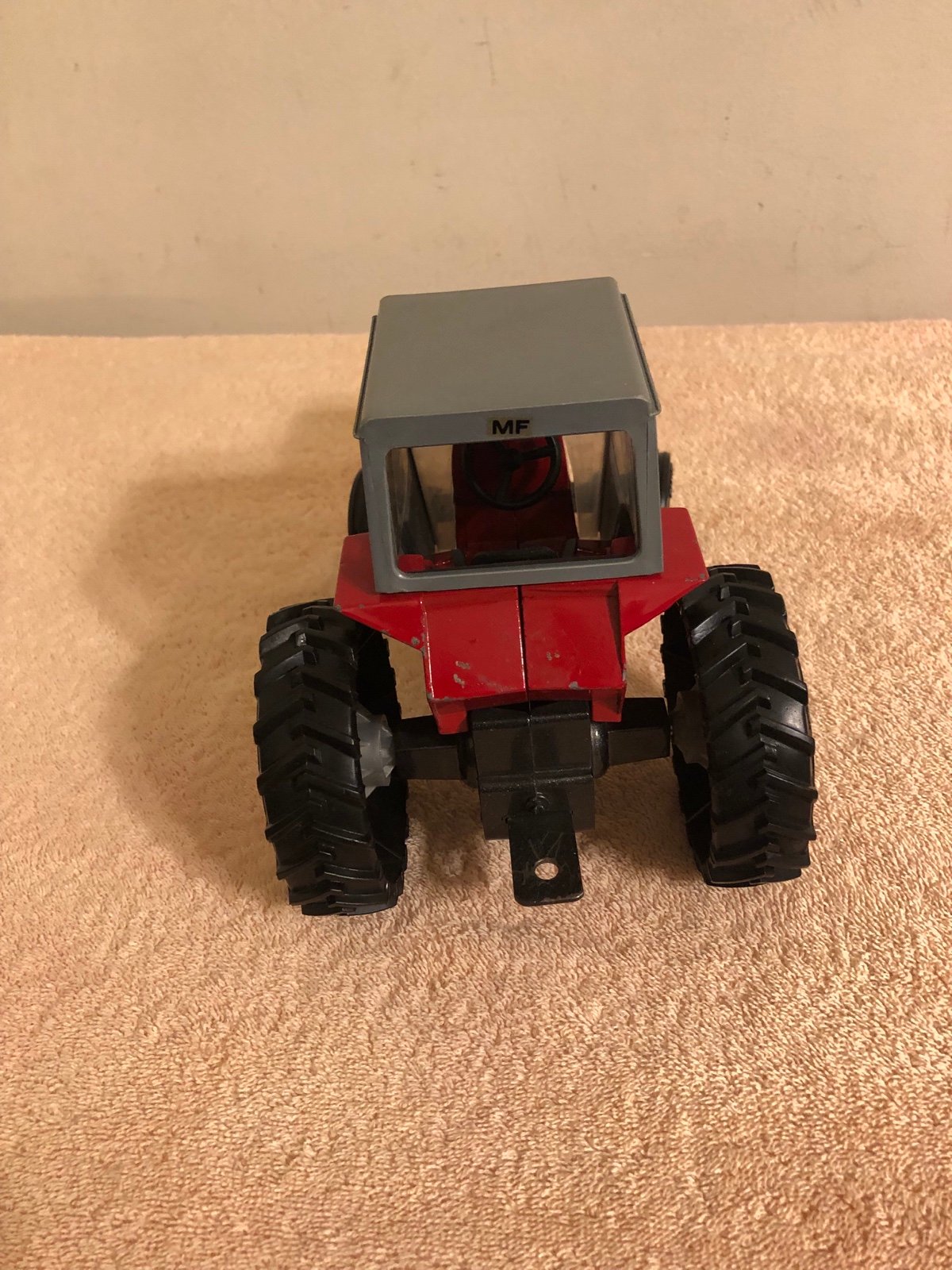 This is missing I believe the stacks on the front of the tractor. The front wheels pivot. Could use some paint touch ups here & there nothing major. All of the cab windows are intact. Nice clean condition. Please view all photos carefully for complete content and condition.