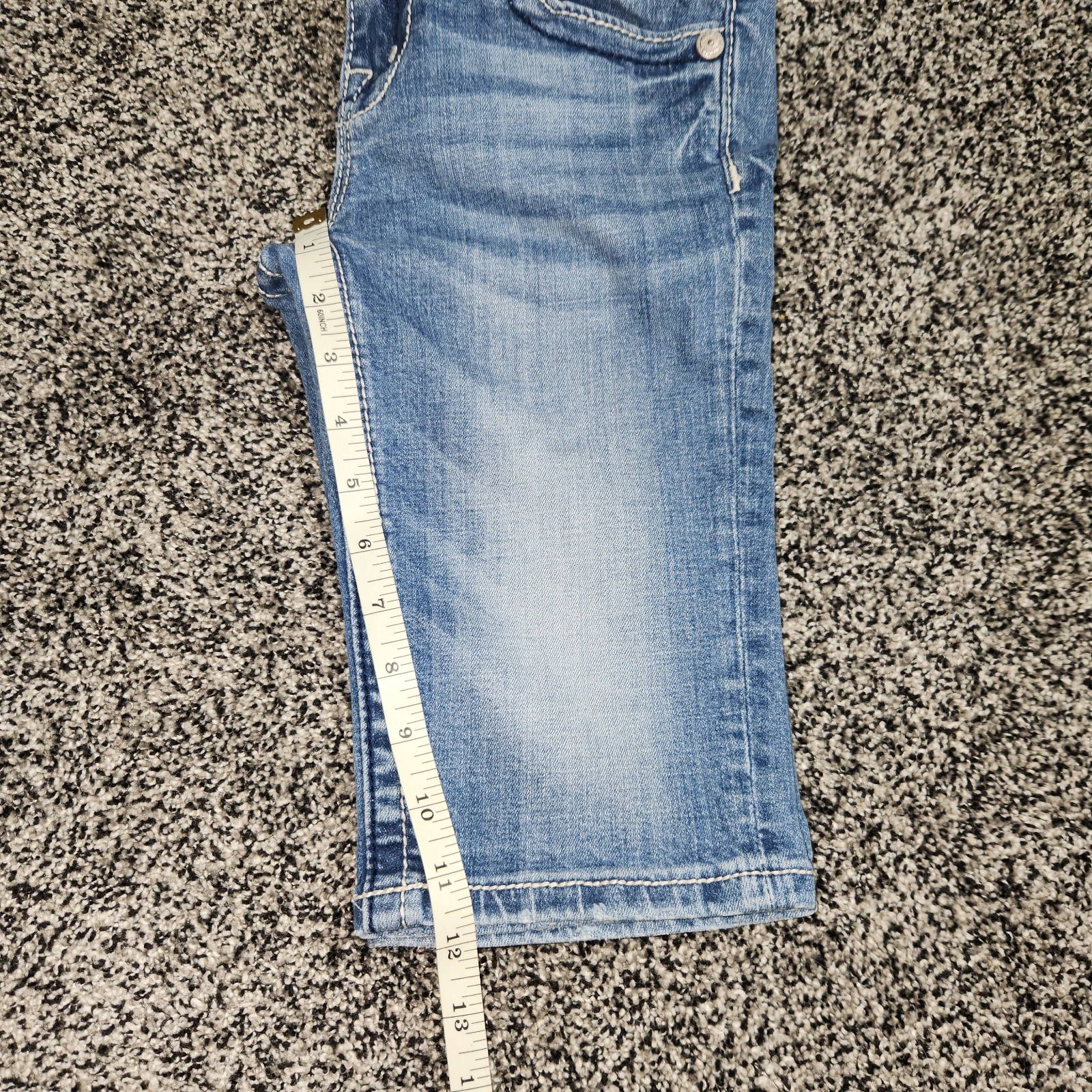 The Miss Me Little Girl Bermuda Jeans Shorts in size 14 feature a light wash color with an 11.5" inseam, making them perfect for young girls. These Bermuda style shorts are designed by the popular brand Miss Me