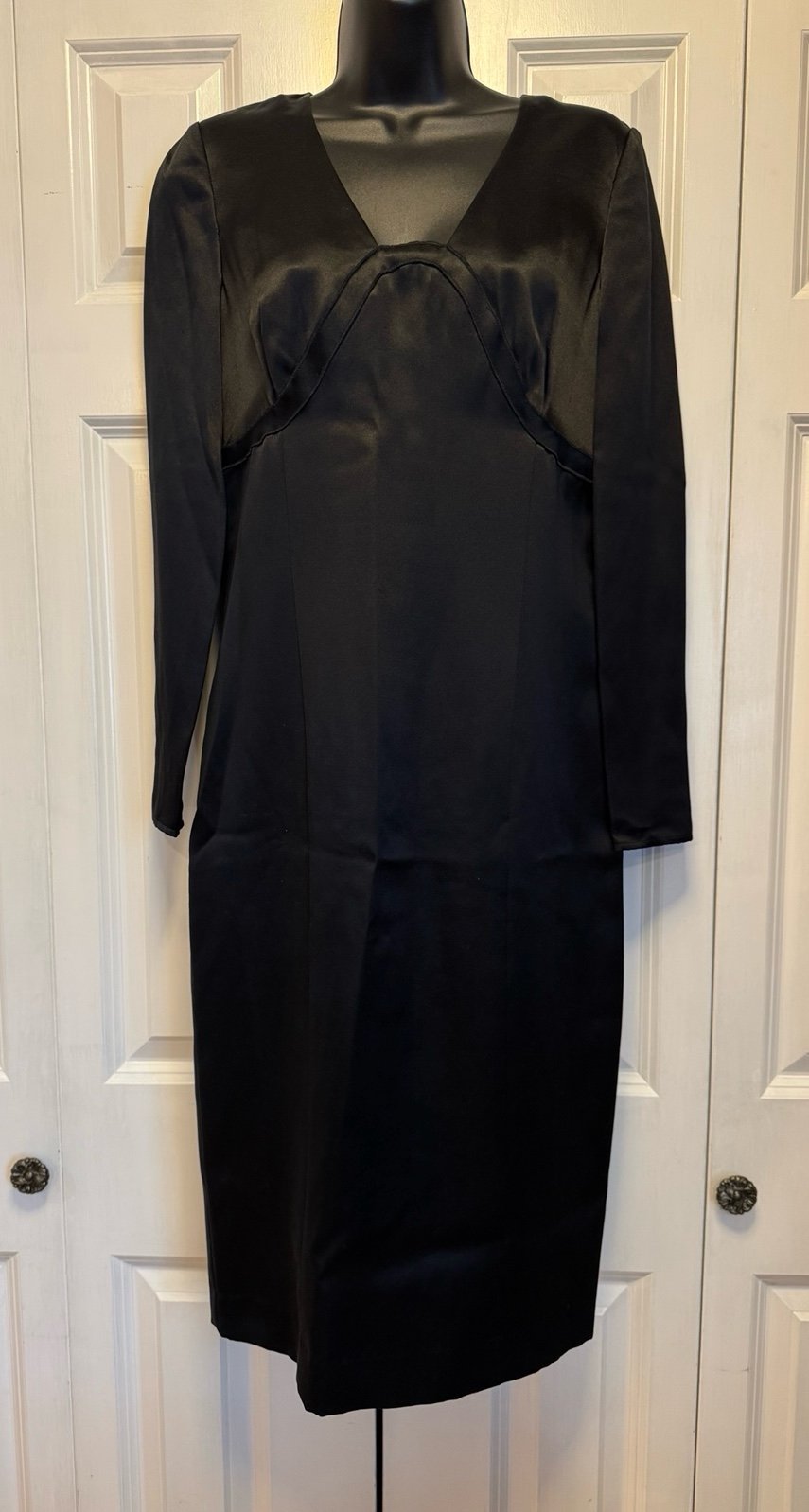 NEW Magaschoni Collection Womens Dress Size 2 Black Sheath Midi Long Sleeve Satin Silk Blend