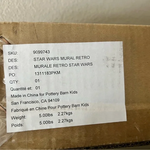 STARWARS RETRO MURAL by Pottery Barn KidsBoyd room wall decor NEW IN BOX NEVER OPENED!Inspire adventure every day with this action-packed Star Wars™ mural. With timeless illustration, it brings a burst of energy into the room.DIMENSIONS48" wide x 72.5" longWeight: 1.5 poundsCAREHandle with care.Avoid contacting the surface with any adhesive-backed products such as tape, decals, etc.Clean with a soft, dry cloth.DETAILS THAT MATTERPrinted ink.Mural is made from polypropylene, polyester and viscose.KEY PRODUCT POINTSAluminium tube, metal hanger, and plastic cap included.