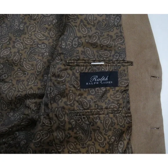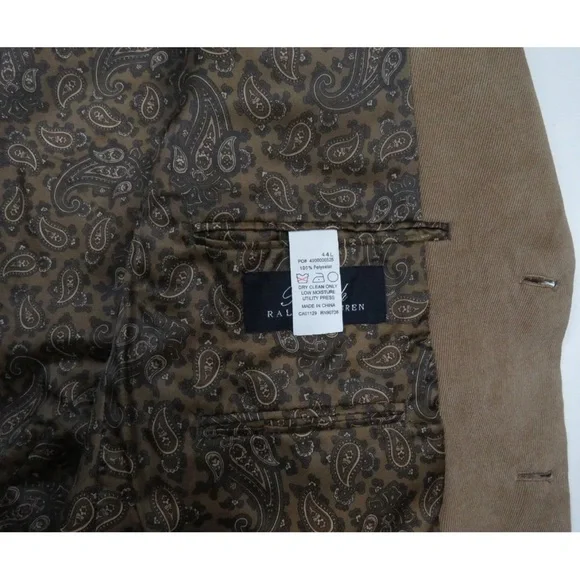 Description: NWOT Ralph Lauren Corduroy Paisley Lined 3 Button Blazer Sport Coat Jacket -Three button closure -Two front flap pockets-Left chest pocket-Ventless back-Four button cuffs -Corduroy-Paisley lined-Notch collarSize (Check Measurements): Mens 44 LColor: Light brownFabric: 100% polyesterCondition: New Without TagsItem#: 66238Measurements are in inchesArmpit to armpit: 23 1/2"Back bottom of the collar to the hem: 32 1/4"Shoulder to shoulder: 20"Shoulder seam to end of cuff: 26"BUYING VINTAGE·We do our best to thoroughly inspect all items for any visible imperfections i.e., rips, repairs, holes, stains, etc. and note as such.·Please note vintage sizes are not always comparable to today's sizing. Please refer to the measurements in the description for a more accurate depiction of the true size. If an issue should arrive, please contact us prior to leaving a negative as we strive for providing excellent customer service.Please compare your measurements to the measurements provided in the listing description to ensure a proper fit. 62914