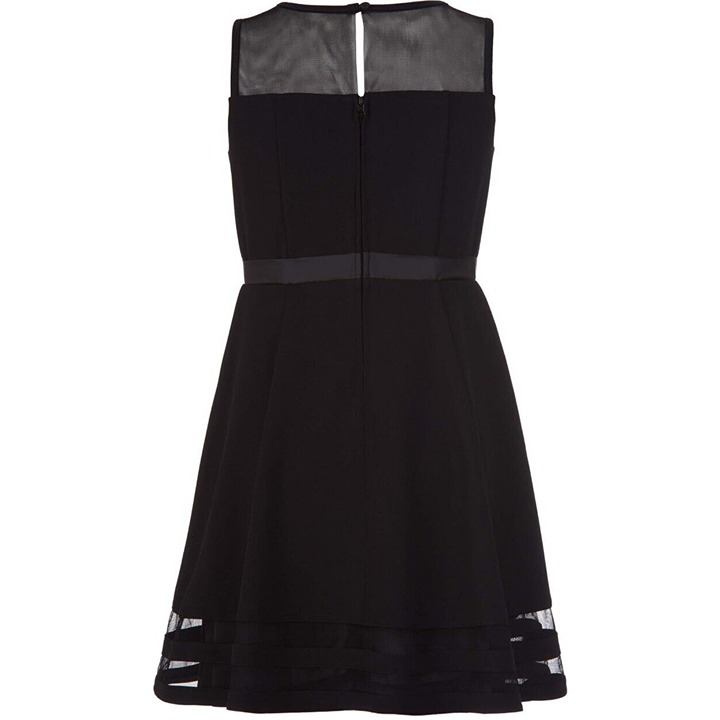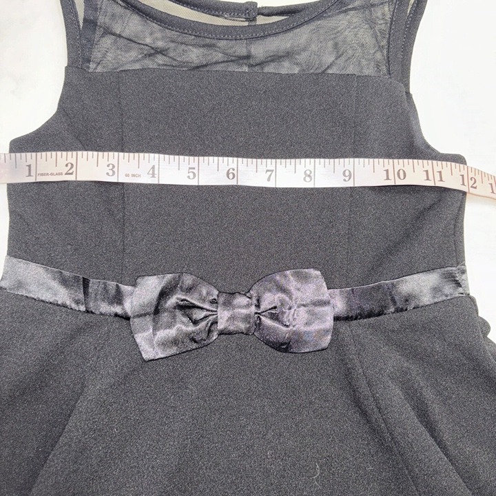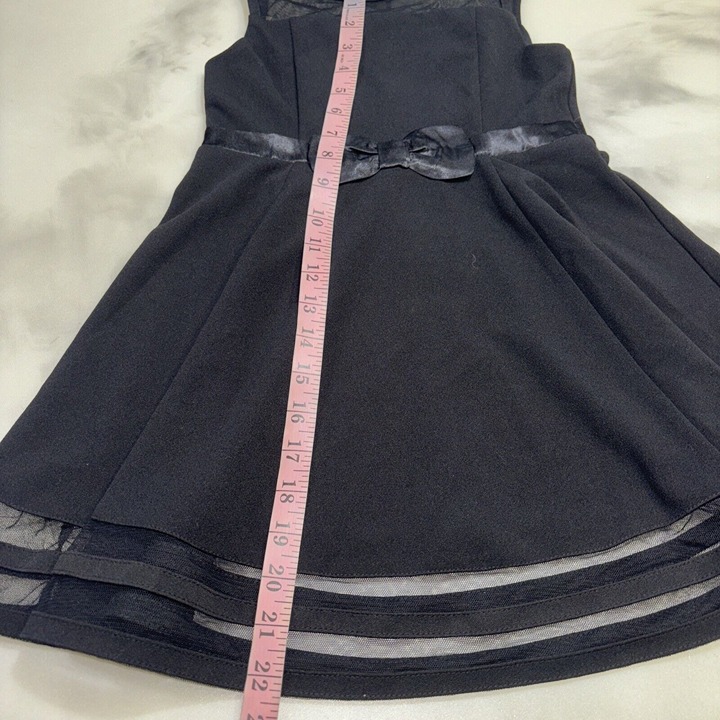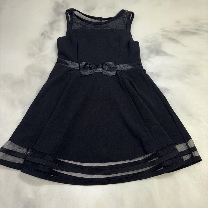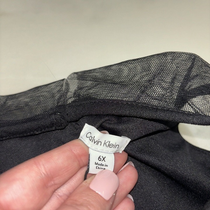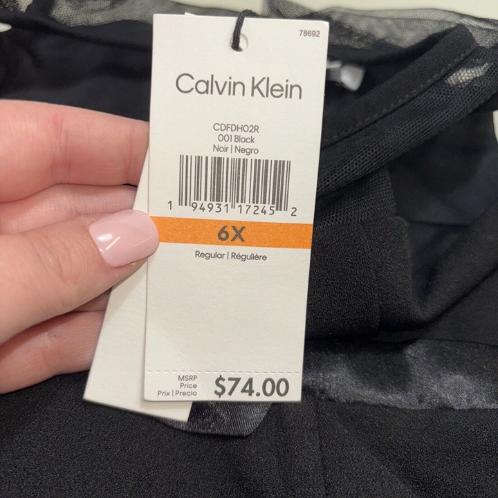 The NWT Calvin Klein Girl's Sleeveless Dress is a fit and flare dress made of polyester and spandex blended fabric. It has a round neckline, a zip closure, and a knee-length hemline. The dress is sleeveless and has a bow and zipper accents. It is designed for girls and comes in black color. The dress is perfect for parties and can be worn in summer, fall, and spring. It is available in size 6X and is not vintage or handmade.