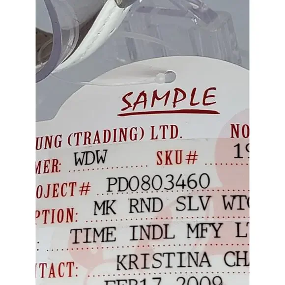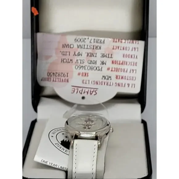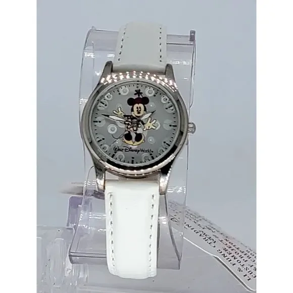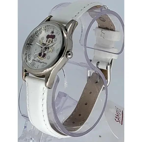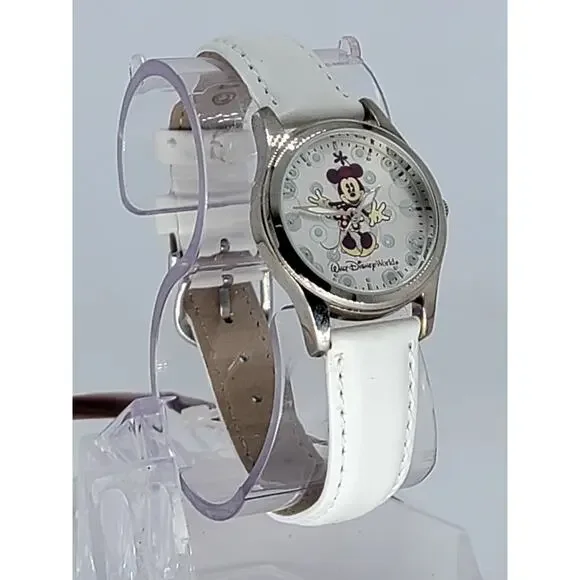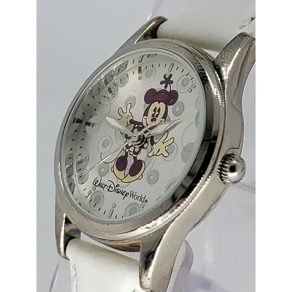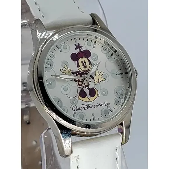 Title: Rare Walt Disney World Minnie Mouse Watch - Pre-Production Sample with White Leather StrapDescription:This exclusive Walt Disney World Minnie Mouse watch is a pre-production sample, making it a rare and sought-after collectible for Disney fans and watch enthusiasts. Featuring Minnie Mouse in an elegant design on a silver-tone dial with intricate detailing, this timepiece is both charming and timeless.The watch is paired with a pristine white leather strap that adds a touch of sophistication, ensuring it can be worn for any occasion or showcased as part of a collection. As a pre-production sample, this piece holds unique value, offering insight into the design and craftsmanship process.The dial also features the iconic Walt Disney World logo, celebrating Disney's magical legacy. This one-of-a-kind watch is perfect as a gift or as an addition to a collection of Disney memorabilia. Don’t miss the opportunity to own this rare piece of Disney history!