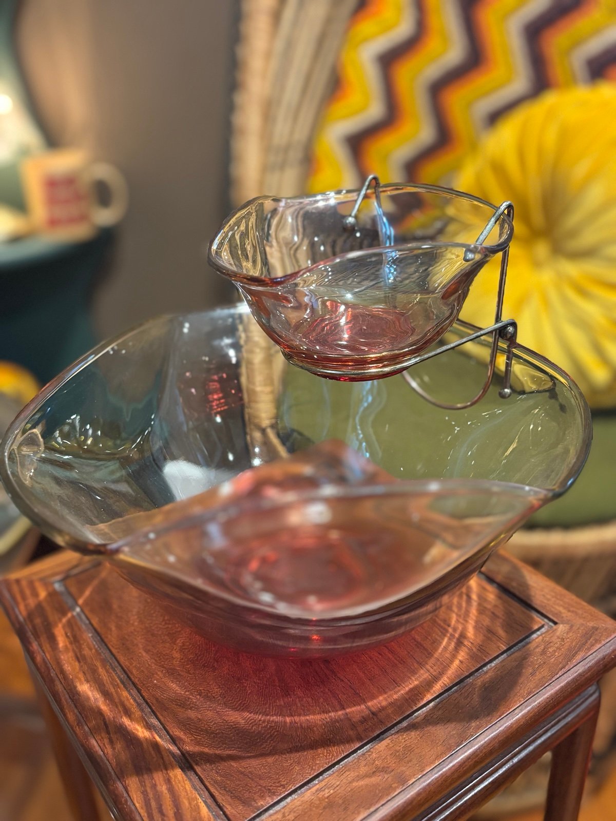 Ready to serve up serious mid-century party vibes? This vintage Anchor-hocking red-pink glass chip and dip set is here to turn snack time into a statement. The large swoopy bowl holds your chips, while the smaller coordinating dip bowl sits perched in its sleek metal hanger, ready for salsa, French onion, or something a little more fabulous.