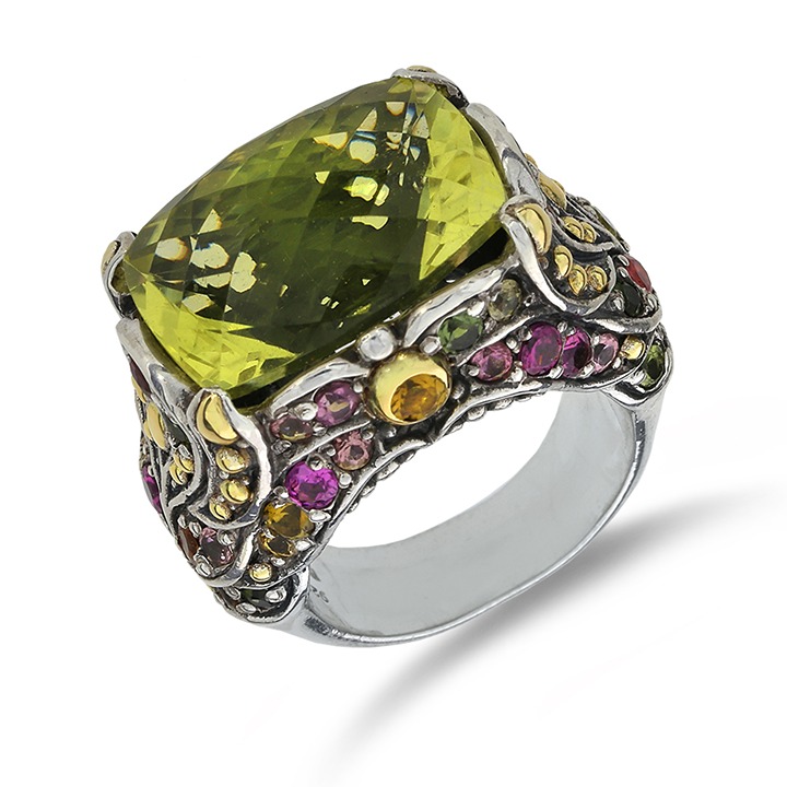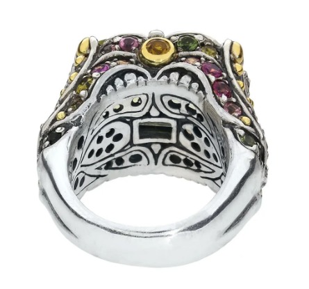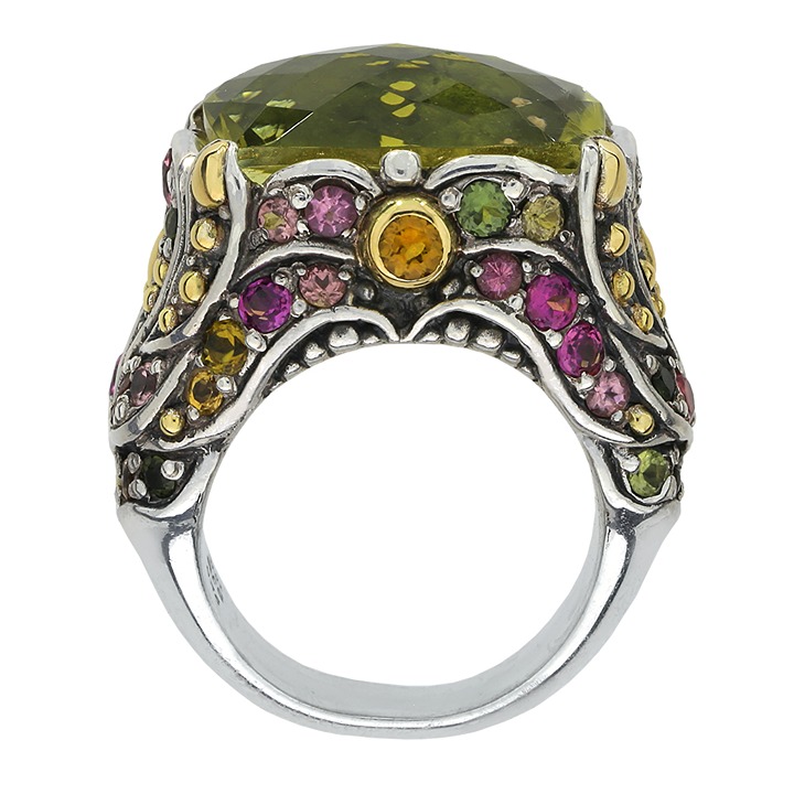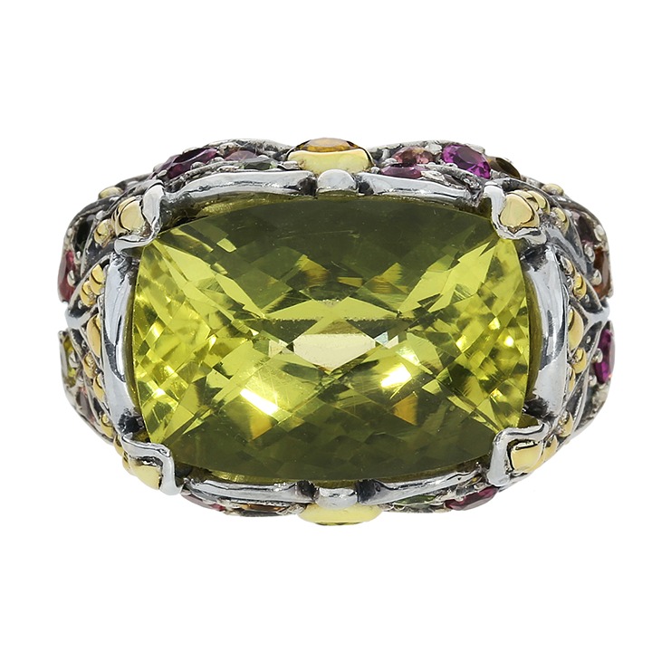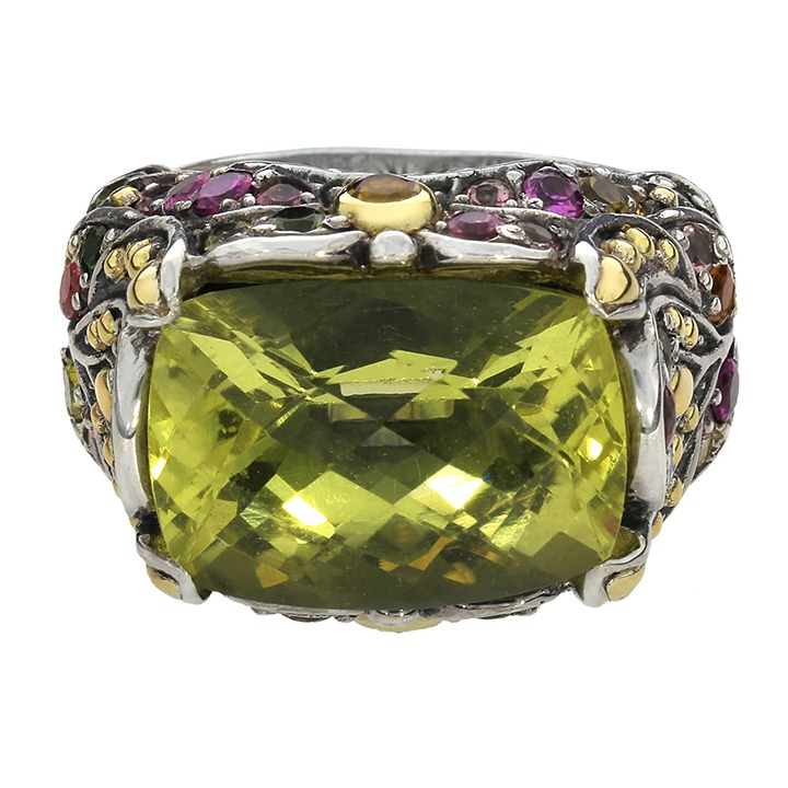 A bold statement ring to be admired created by Samuel Benham's iconic Bali style with a 14.72ct checkerboard cushion lemon quartz accented by 2.56ctw of multicolored tourmalines all set prong and bezel into 18K yellow gold and sterling silver.