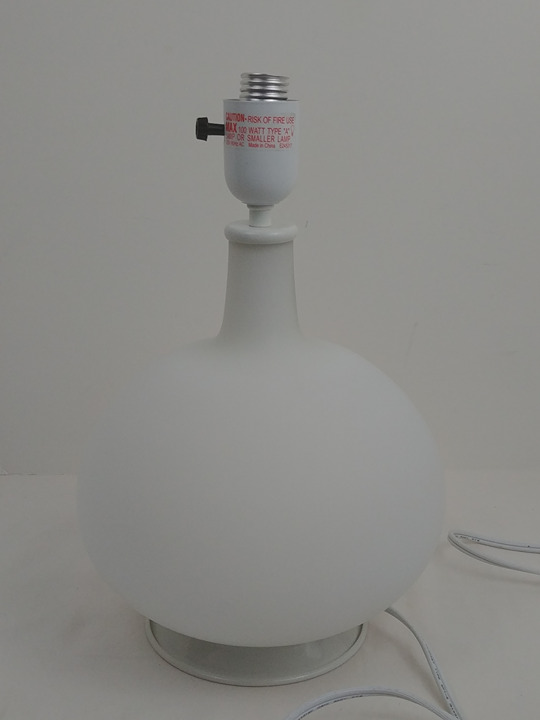 White round lamp with beige shade. I believe lamp is glass with a metal base. Felt covering on bottom has some stains (photo #7). Takes max 100 watt type A bulbs.