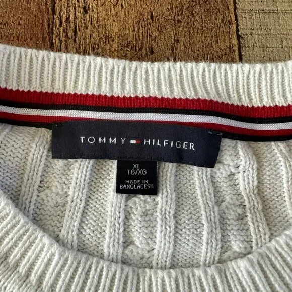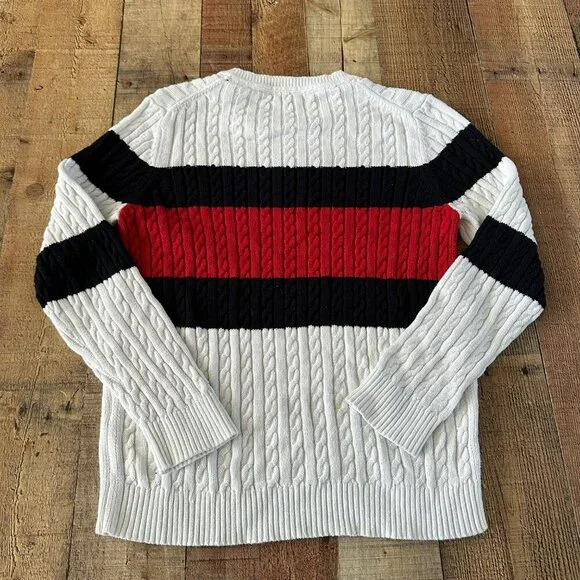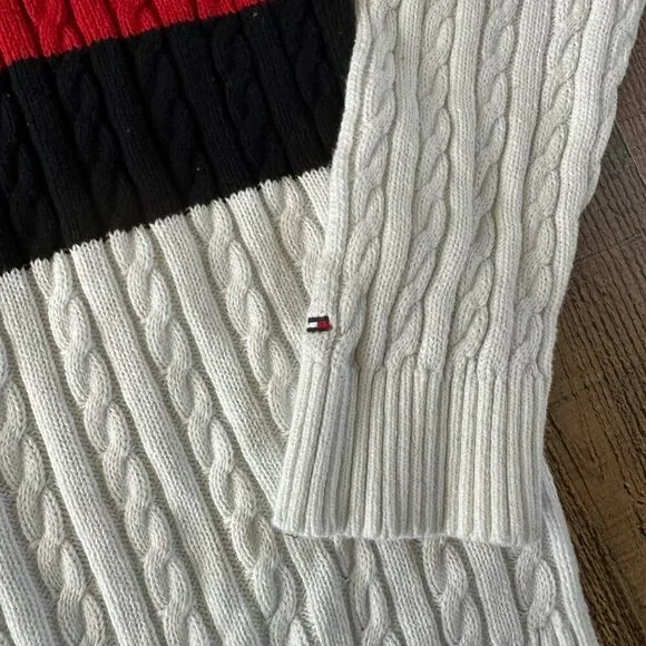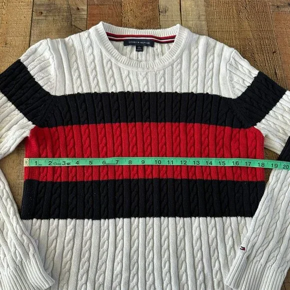 Tommy Hilfiger XL Cable Knit Sweater Red & Black Stripes Boys Cozy Winter WearSnuggle up in this stylish Tommy Hilfiger cable knit sweater. With bold red and black stripes, it’s like wearing a chic candy cane!• 100% Cotton• Bold Red & Black Stripes• Cable Knit Design• Crew Neck• Long Sleeves• Machine WashableMeasurements see images for referencePit to Pit: 18 inLength 25.5 inSize: Boys XLCondition: Pre-Owned GoodThere is a small hole on the bottom see images for reference. All major flaws have been disclosed. This is a preowned item and may have some small additional imperfections. ⭐️5 Star Seller⭐️Fast Shipping⭐️Carefully Packaged⭐️Smoke Free Home⭐️Low Offers DeclinedNew to ? Enter the code LUCYANDLYLA when you sign up and receive $10 off your first order!
