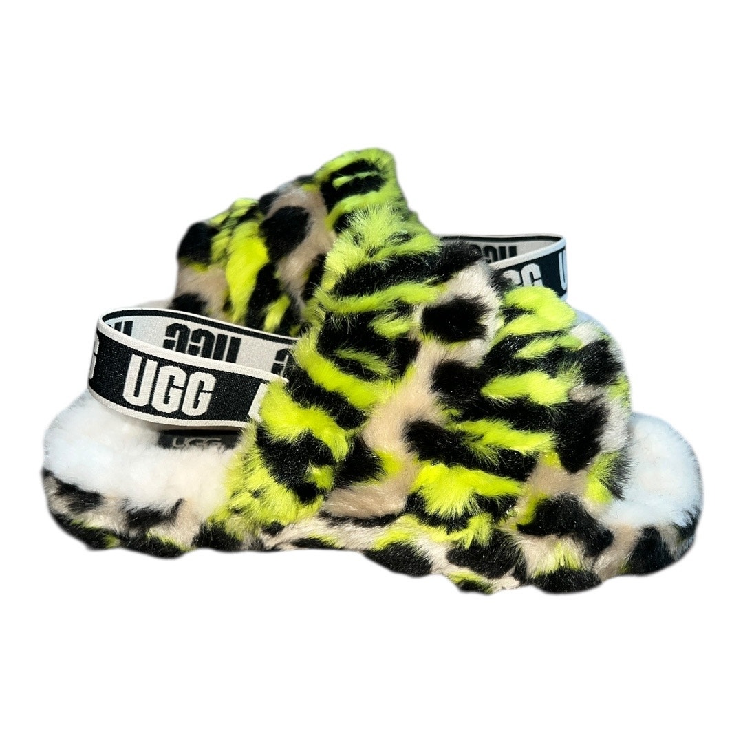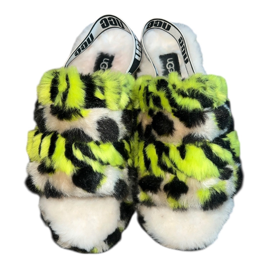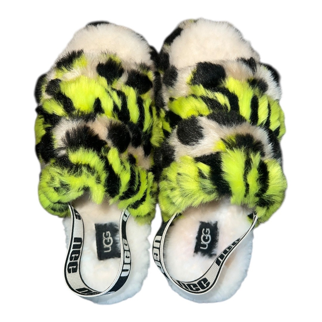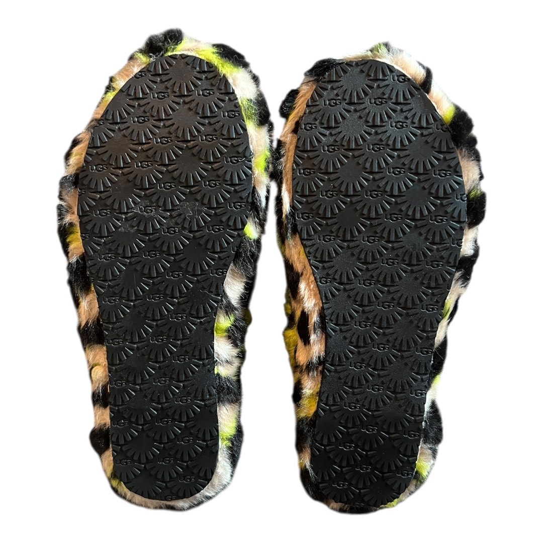 Super cozy and fun UGG Fluff Yeah Animilia slides in excellent condition. Worn only once or twice (if ever) the faux shearling is still soft, plush, and vibrant with no matting. The Animilia print features a stylish mix of tan, cream, and brown tones in a subtle leopard-inspired pattern that adds a trendy touch to any casual outfit.