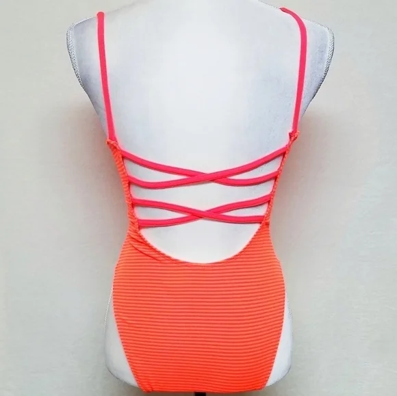 Vintage 90s Splash Neon Pink Orange Strappy Back High Rise Swimsuit.- Neon Pink and Orange Stripes with Neon Orange Trim- Extra High Rise Sides, High Rise Hips- Low Cut Strappy Back with Spaghetti Straps- Loose Thread on One StrapSize MediumApproximate Measurements(Flatlay):Length (Bust to Rise Seam) - 23 inchesVintage, Retro, 90s, Gnarly, Fly, Killer, Tubular, Bodacious, Totally Hot, Vintage Swimsuit, Vintage One-piece