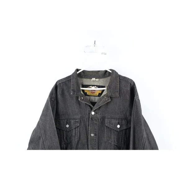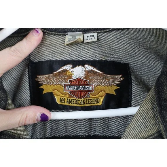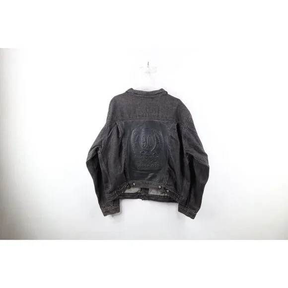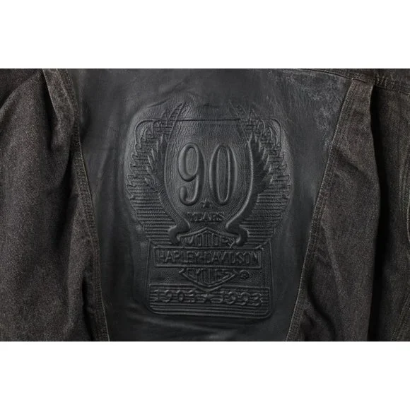 Vtg 90s Harley Davidson Mens XL 90th Anniversary Leather Denim Trucker JacketMens JacketDiscoloring on inner collar, front button flaps and cuffs. Blemish bottom right. Distressing on leather on back. USA madeMens size XLargeMeasurements are:25.5 inches underarm to underarm26.5 inches top to bottomBlackCotton Check out my other items in my store!V754